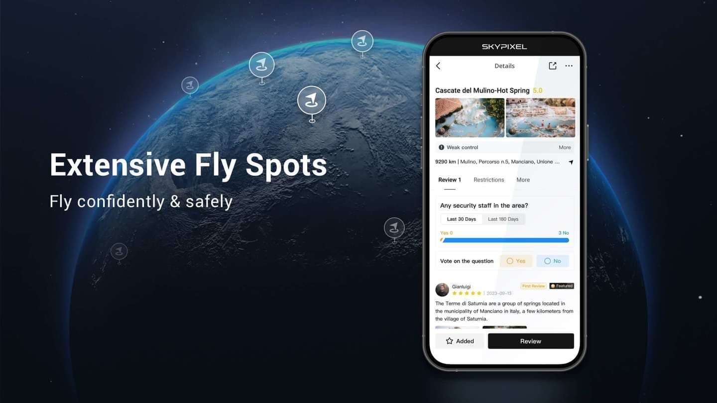 付近のフライスポットや現地の規制の最新情報を入手できます。初心者パイロットでも不安を感じずに離陸して、どの飛行も思いっきり楽しめます。