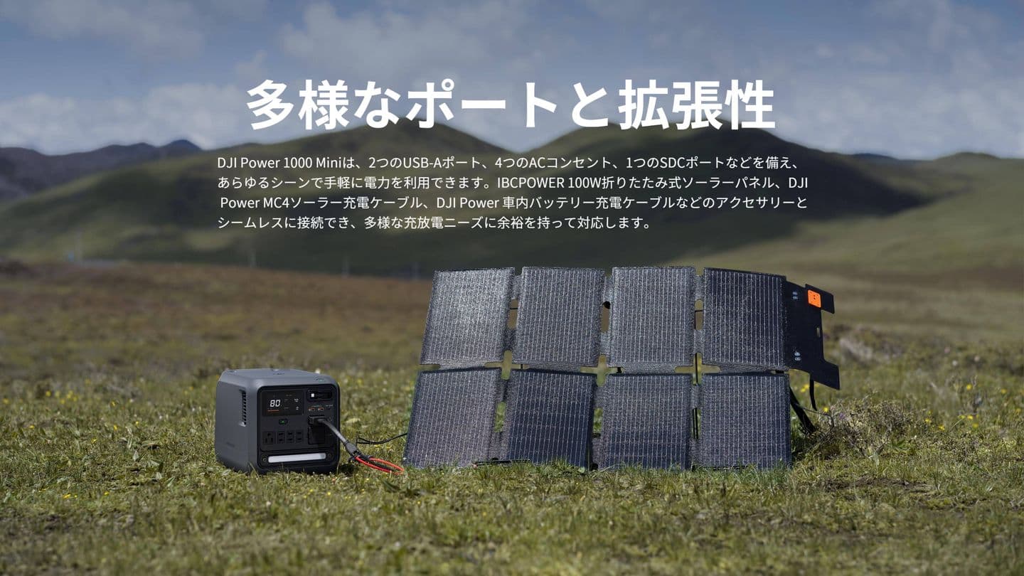 DJI Power 1000 Miniは、家庭用電源、ソーラー、車からの充電に対応しています[11]。屋内や屋外はもちろん、移動中でも、さまざまな充電方式で便利に電化製品をご利用いただけます。