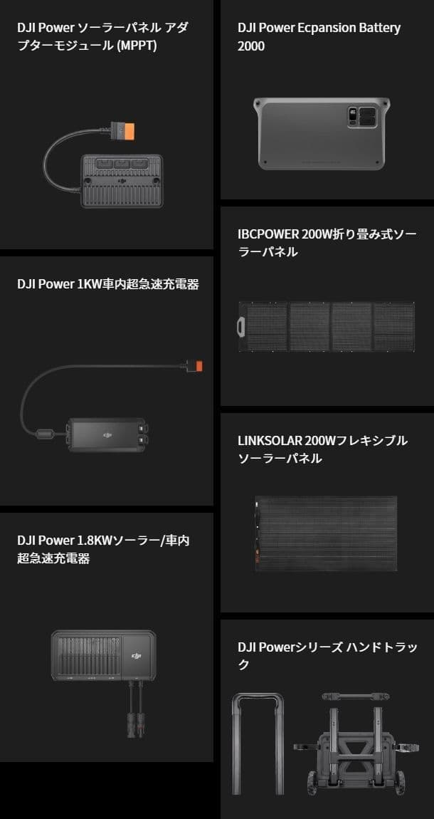 DJI Power 2000は、2つの140WのUSB-Cポートに[24]、2つの65WのUSB-Cポート、4つのUSB-Aポート、4つのAC出力ポート、2つの完全なSDCポート、2つの1/4インチねじポートを備えており、さまざまなDJI Powerシリーズのアクセサリーや異なるモデルのソーラーパネル、電源ケーブル、アダプターケーブルに接続して、多様な拡張ニーズに対応できます。