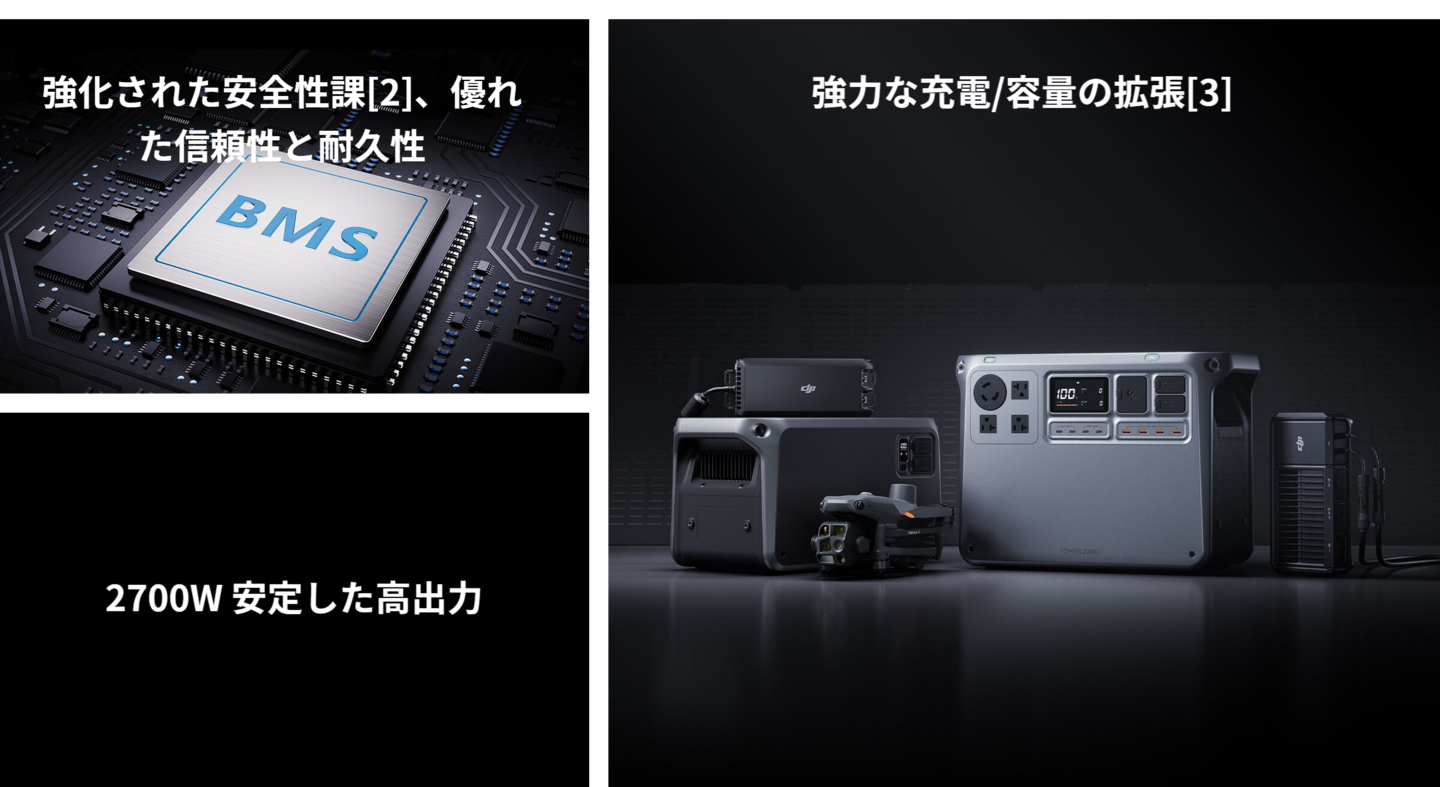 DJI Power 2000は、バッテリーが切れるまで安定して2700Wの連続出力を維持でき、IHクッキングヒーター、電子レンジ、オーブンなど99%以上の家庭用電化製品を駆動させることができます[7]。また、4つのACコンセント、4つのUSB-Cポート、4つのUSB-Aポートを備えており、複数のスマートフォンやタブレット、高出力機器を同時に手間なく充電できます。