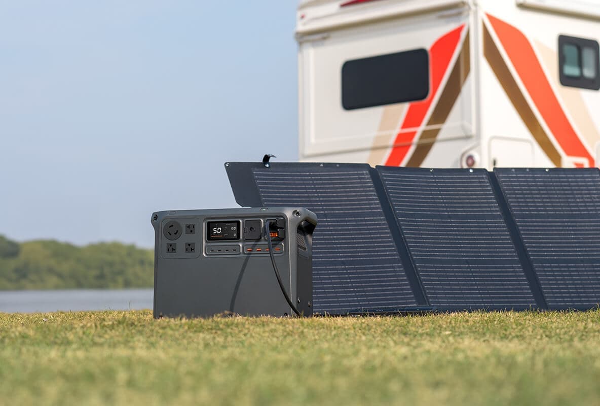 DJI Power 1.8kWソーラー/車内超急速充電器[5]は、ソーラーパネルとRV[26]のオルタネーターに同時接続でき、最大1200Wのソーラーパワーと600Wの連続車載電力を合わせて提供し、Power 2000を素早く再充電。フル充電にかかる時間はわずか約75分[21]です。キャンプ場に駐車中は、電力網とソーラーパネルの両方に接続してハイブリッド充電を行い、長距離移動中も安定した電力供給を確保できます。