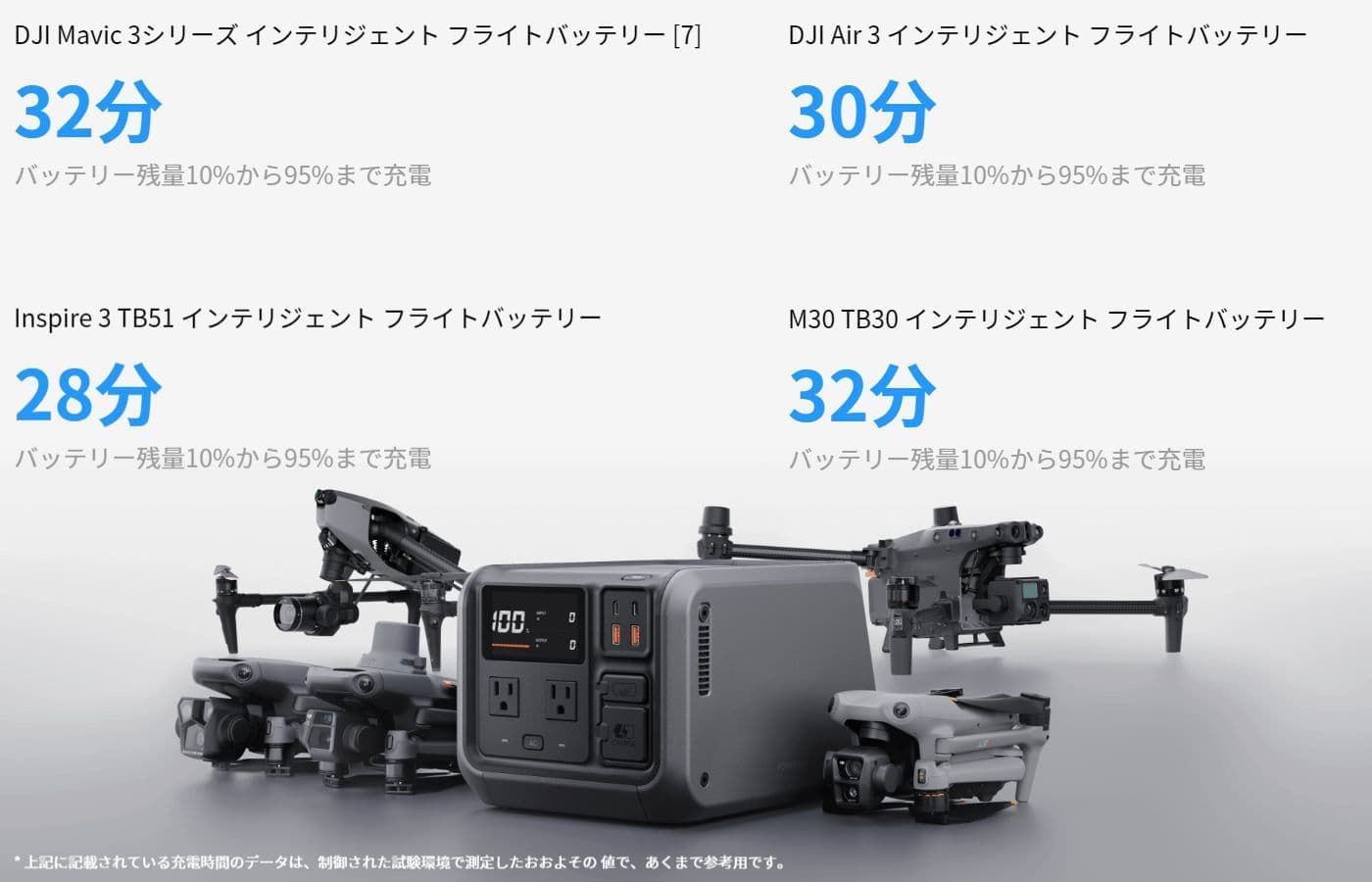 * 25℃のラボ環境下で、DJI Power 500を使用して、特定のブランドの製品を充電した場合の測定データです。このデータはおおよその値で、あくまで参考用です。実際の値は、状況により異なる場合があります。