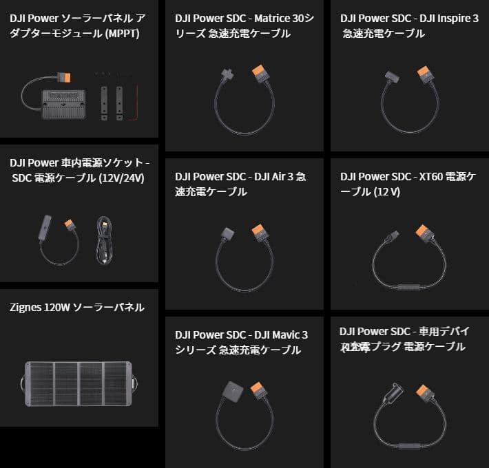 * DJI認定ブランドZignesのソーラーパネルを使用することをお勧めします。DJI Power 500は、最大300 Wの太陽光発電 電力入力に対応し、太陽光発電で充電した場合、約1.8時間〜4時間ほどで完全充電できます。[11]