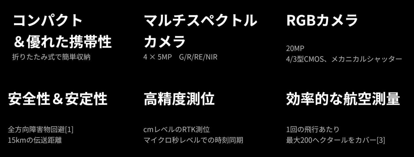 | ホバリング精度範囲 | 垂直:±0.1 m(ビジョンポジショニング有効時)、±0.5 m(GNSSポジショニング有効時)、±0.1 m(D-RTK有効時) |