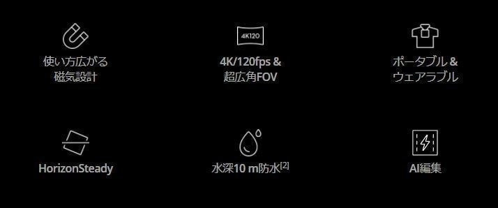 ・DJI Action 2は、4K/100fps、4K/120fps、1080p/120fps、4K 4倍スローモーション、1080p 8倍スローモーション撮影時は、以下の制限がかかります:音声操作を使用することはできません;フロントタッチ画面モジュールの画面には、撮影モードの情報のみが表示されます;音声録音はカメラユニットに内蔵されているマイクのみで録音します。