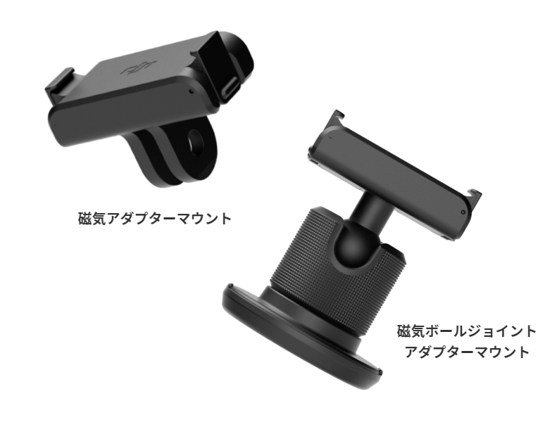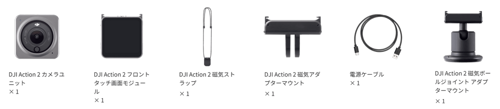 ・DJI Action 2 Dual-Screenコンボ同梱物:DII Action 2 カメラユニット × 1、フロントタッチ画面モジュール × 1、磁気ストラップ × 1、磁気ボールジョイント アダプターマウント × 1、磁気アダプターマウント × 1、電源ケーブル × 1