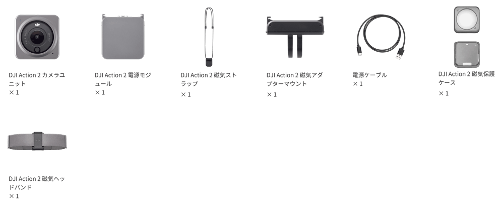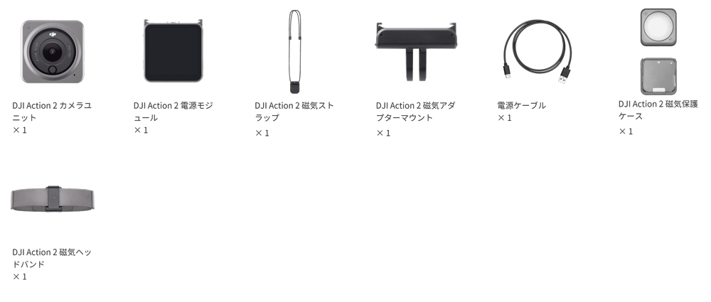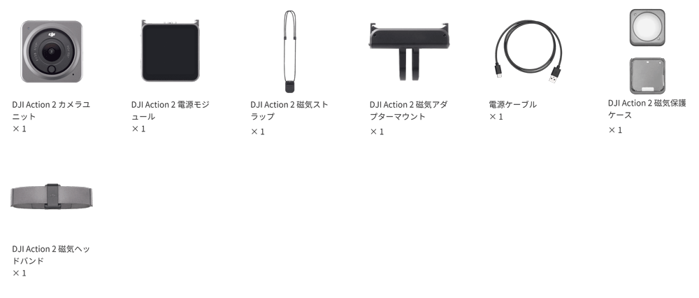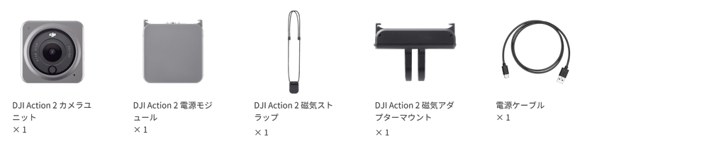DJI Action 2 Powerコンボ同梱物:DII Action 2 カメラユニット × 1、電源モジュール × 1、磁気ストラップ × 1、磁気アダプターマウント × 1、電源ケーブル × 1