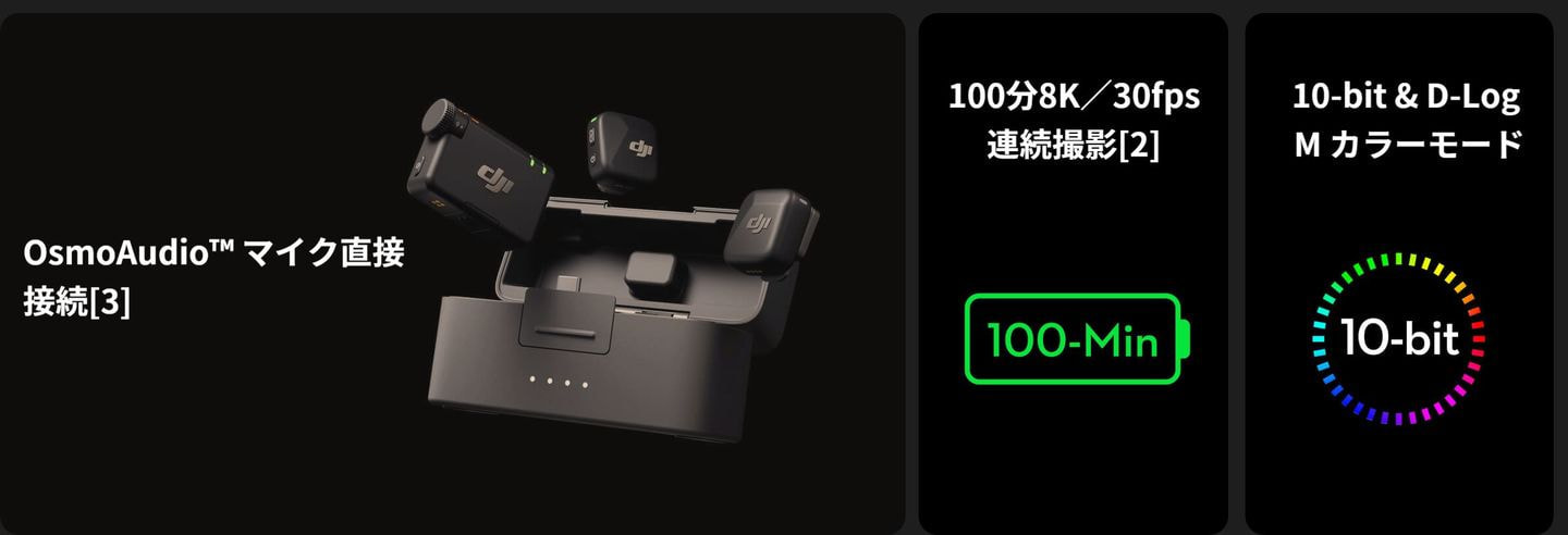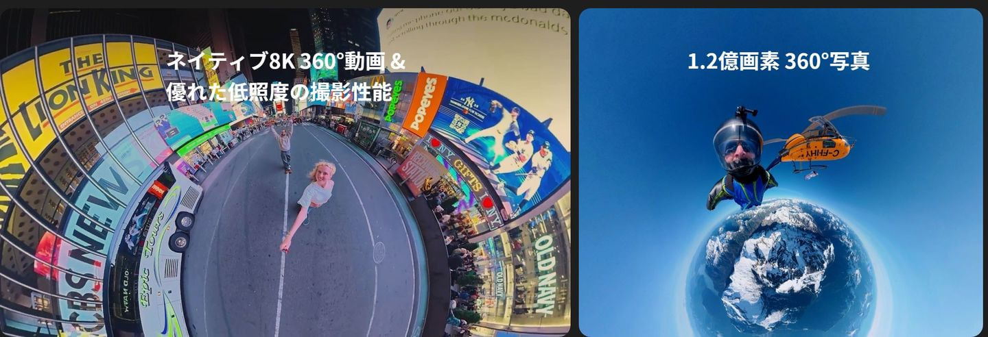 4.「DJI初」とは、2025年7月31日の発売日において、Osmo 360が、2つの4000 × 4000の正方形センサーを備え、ネイティブ8Kの360°動画を2.4 μmの大きなピクセルで撮影できるDJI初のカメラであることを指しています。