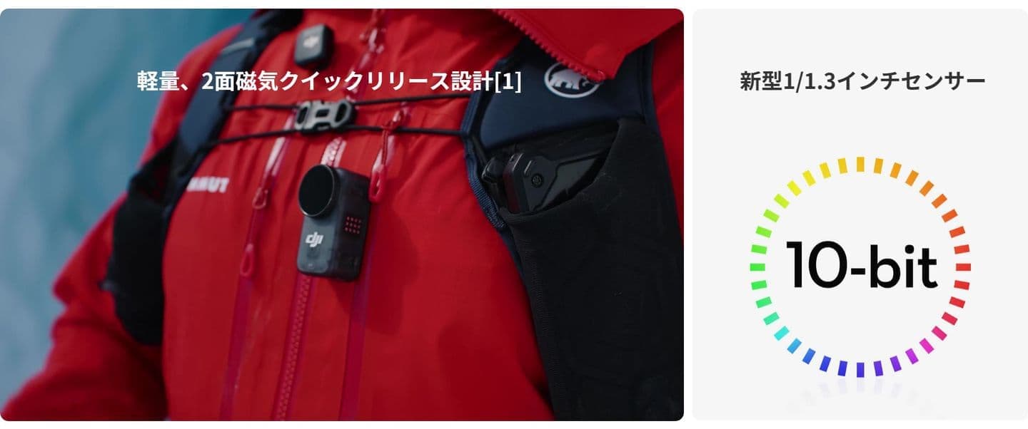 カメラは追加のハウジングなしで最大10メートルの防まつ性を備えており[4]、水中撮影に最適です。多機能ビジョンドックと組み合わせると、IPX4等級の防滴性能[5]を提供し、汗や雨、軽い水しぶきから本体を保護します。安心してエキサイティングなウォータースポーツや屋外アクティビティを撮影できます。