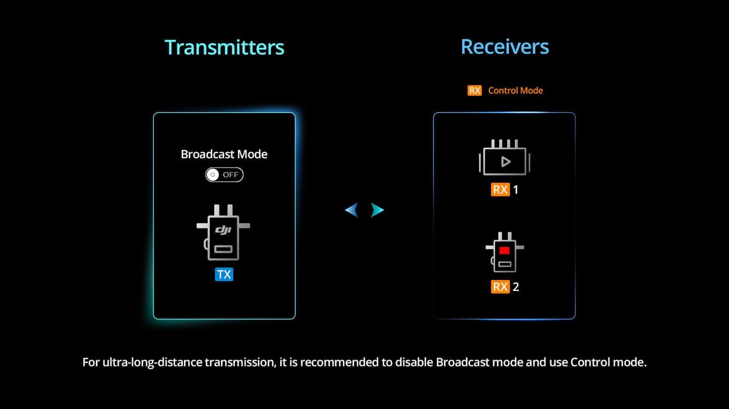 次に、Ronin 2、RS 3 Pro、およびカメラのフォーカス調整は、最大2台のレシーバー側で遠隔操作することができ、配信モードで接続された他のデバイスには影響しません。