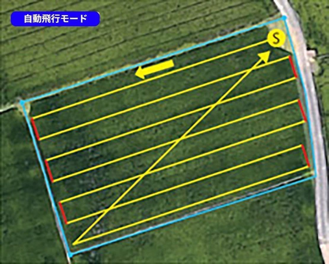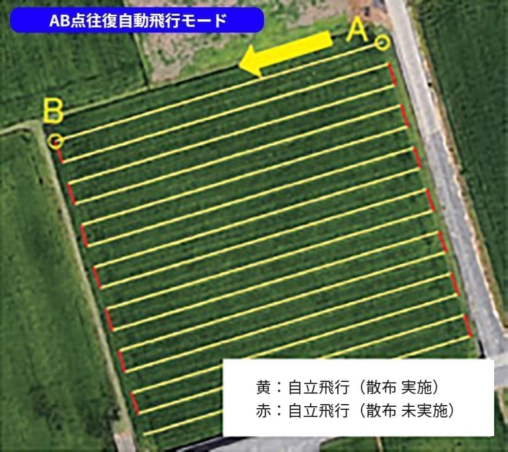 実際に機体を飛行してA 地点・B 地点の登録を行うことで自動散布が行なえます。A 地点とB 地点を結ぶラインと平行になるように散布していき、終了操作は操縦者が行います。散布範囲が四角になるため、ほ場整備された散布範囲などに有効なモードです。