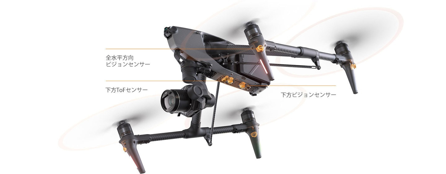 Inspire 3は、9個のセンサーを使った強力な全方向障害物検知システムが搭載され、あらゆる方向の障害物を検知し、飛行を包括的に保護します。[7]