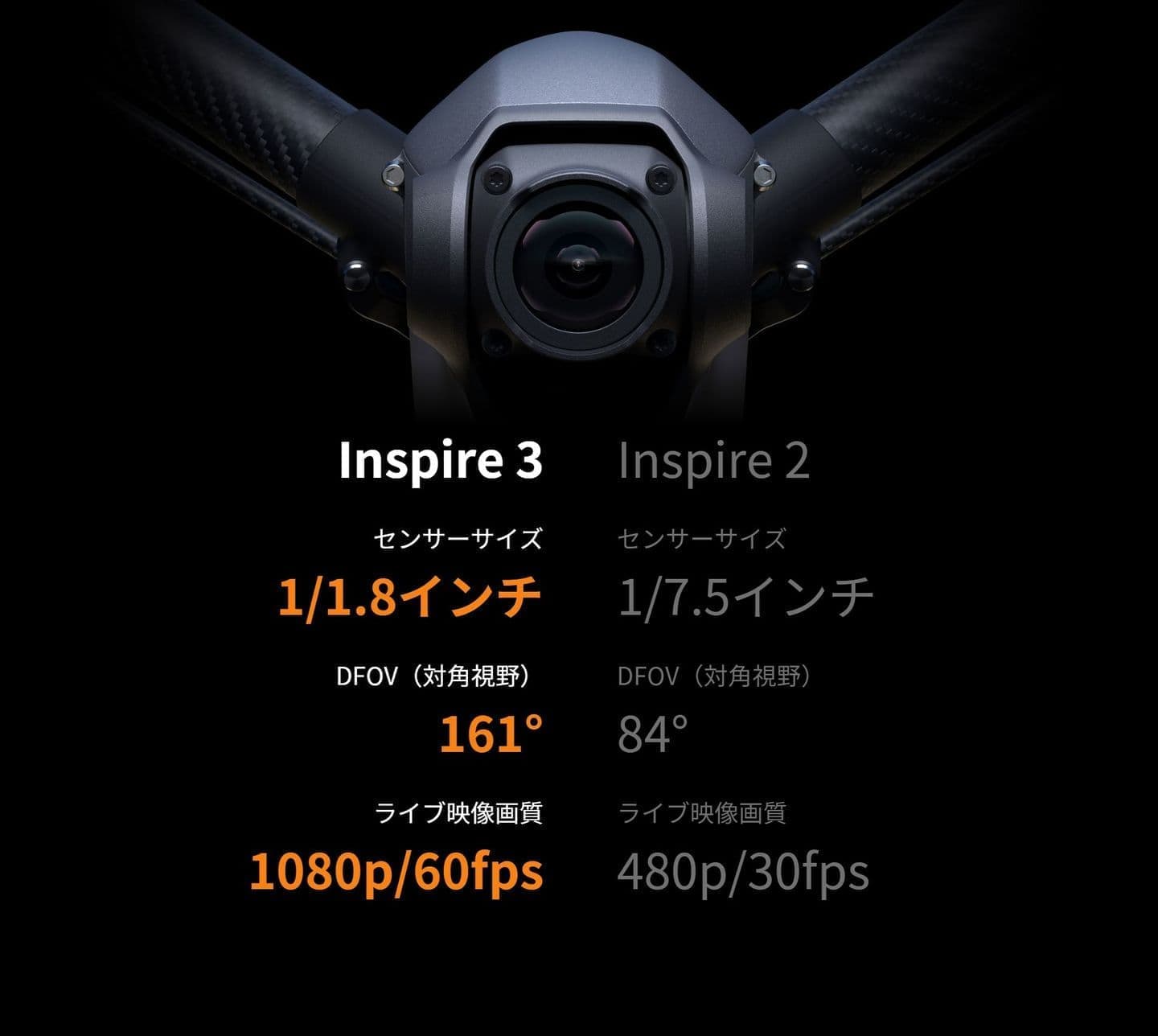 Inspire 3は、新たに1/1.8インチセンサー搭載FPVカメラを備え、3μmピクセルサイズ、161° 超広角FOV、最大1080p/60fpsのライブ映像伝送に対応しています。 DFOV(対角視野)は、前モデルの約2倍となっています。このFPVカメラは、光への感度がとても高いため、パイロットは夜間でも周辺環境を鮮明でクリアな映像で確認でき、優れた飛行安全性を確保できます。(夜間飛行は、ご利用になる国・地域の法律と規制に必ず従ってください)