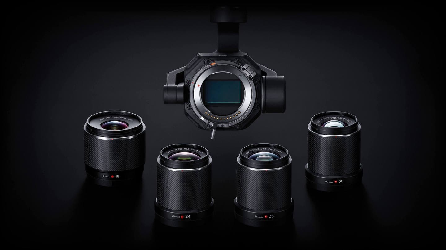 X9-8K Airは、DJI独自開発のDLマウントに対応し、既存のフルサイズ DL 24/35/50 mm F2.8のレンズ群に加え、新登場の18 mm F2.8フルサイズ超広角レンズや望遠レンズ [12] とも互換性を持っています。これら5種類のレンズは、全て空撮用にカスタム設計されています。