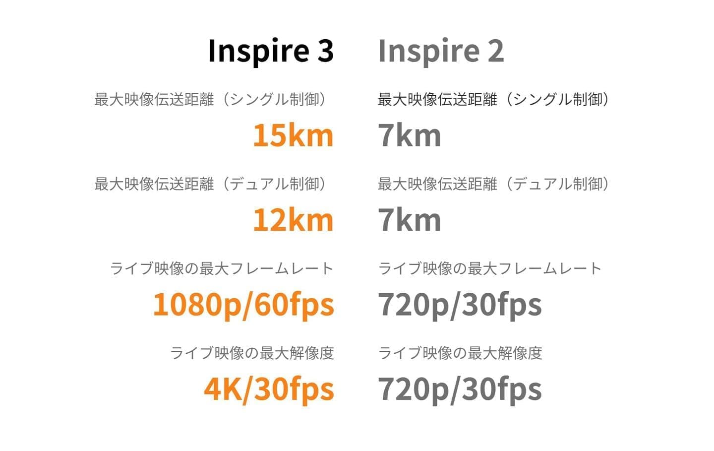 | ジンバルカメラ(4K/30fpsライブ映像):約4 km (FCC)、2.4 km (CE/SRRC/MIC(日本)) | |