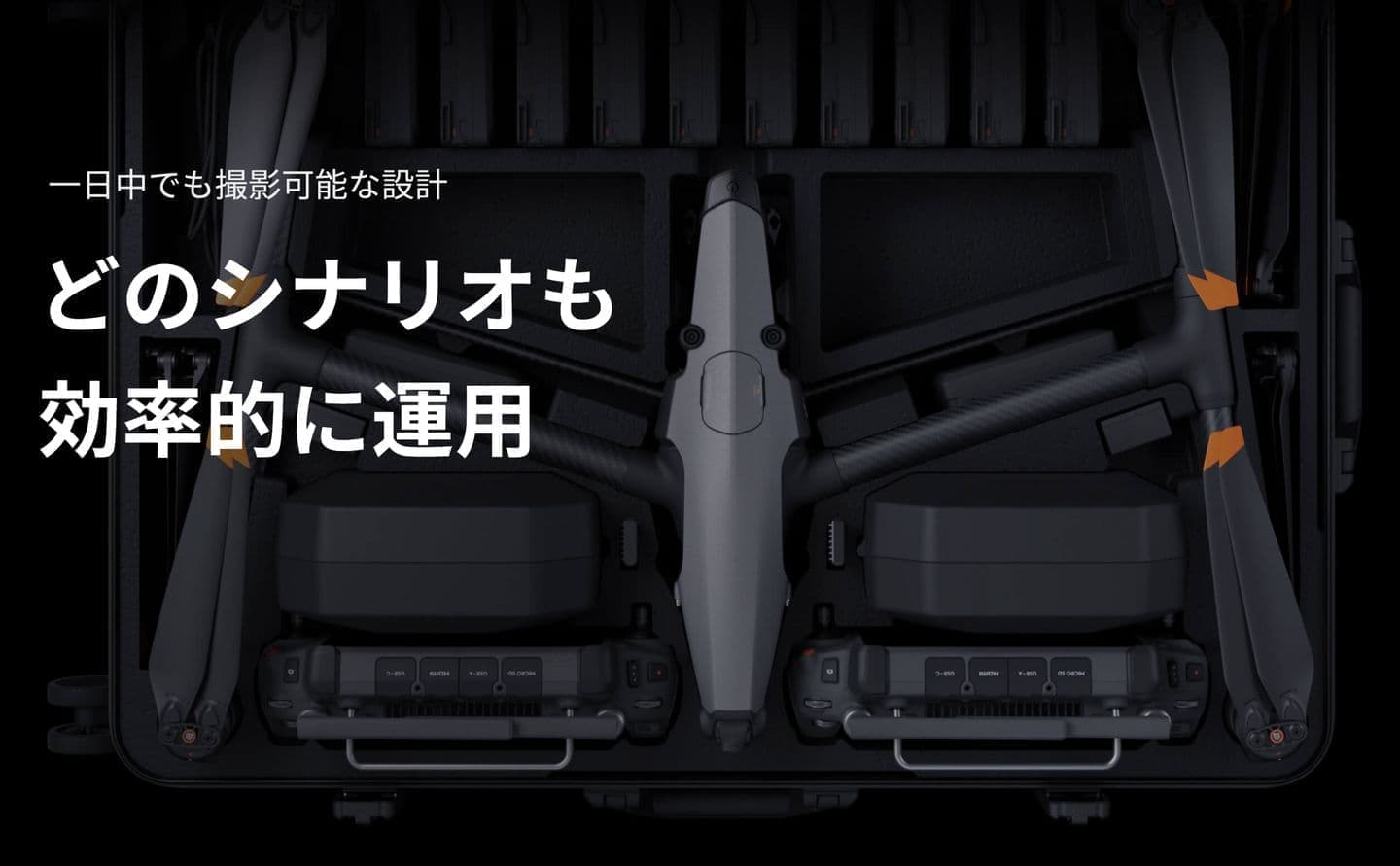 新デザインのトロリーケースは、1つの伸縮式ハンドル、2つのサイドハンドルが搭載され、車輪は360°回転できるので、現場間の移動や輸送が楽に行えます。また、暗証番号を設定できるダイヤルロックが2箇所に搭載されているため、安全性が向上しています。精巧に設計されたトロリーケースには、機体 × 1、X9-8K Airジンバルカメラ × 1、RC Plus送信機 × 2、レンズ × 4、バッテリー × 12、バッテリー充電ハブ × 2、プロペラ × 3組などのアイテムを収納できます。新設計の折りたたみ可能なクイックリリース プロペラは簡単に収納でき、各飛行前に再度取り付ける必要はありません。