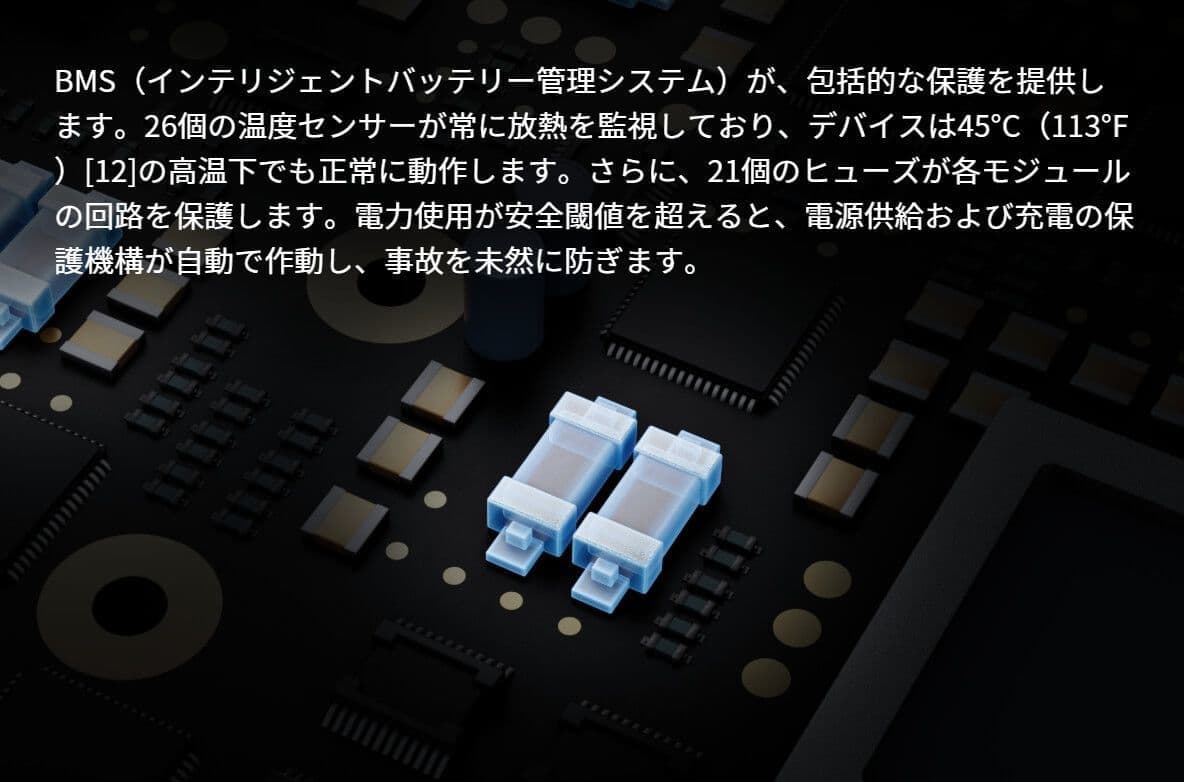 DJI Power 2000は安全性を最優先に設計されており、ボディ構造やセル化学、システムソフトウェアに至るまで細部にわたり配慮が行き届いています。また、先進的な電力管理機能を備えており、長期間オフにしてもバッテリー残量を維持し、電源を入れればすぐに使用可能です。[14] さらに、最大5年間の保証[4]が付いており、長期にわたる安心を提供します。