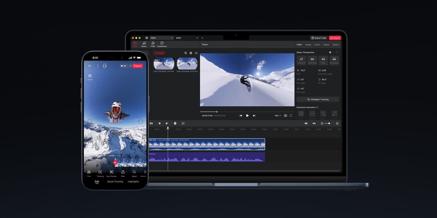 DJI MimoまたはDJI Studioを使用して、360°ビデオを最初から最後まで編集しましょう。DJI Studioはさまざまなツールを内蔵し、編集、エクスポート、共有をすべて一箇所で行うことができます。さらに、専用のPremiereプラグインを使用すれば、ワークフローを効率化し、Premiereで直接360°動画を作成できます。