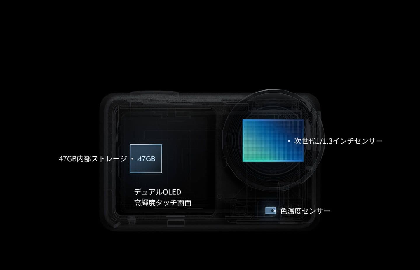 | 内蔵ストレージ容量 | カメラには64 GBのストレージが内蔵されており、47 GBを使用できます。ストレージ容量は、microSDカードを挿入して増やすことができます。 |