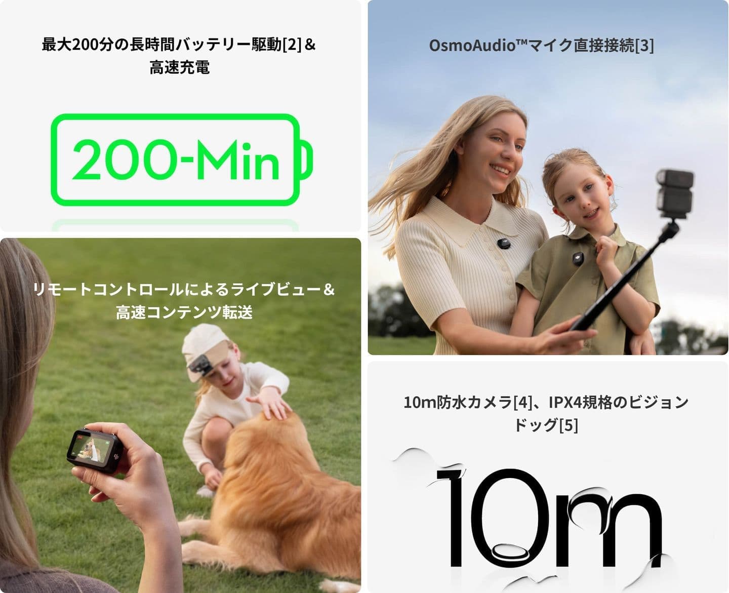 カメラは追加のハウジングなしで最大10メートルの防まつ性を備えており[4]、水中撮影に最適です。多機能ビジョンドックと組み合わせると、IPX4等級の防滴性能[5]を提供し、汗や雨、軽い水しぶきから本体を保護します。安心してエキサイティングなウォータースポーツや屋外アクティビティを撮影できます。
