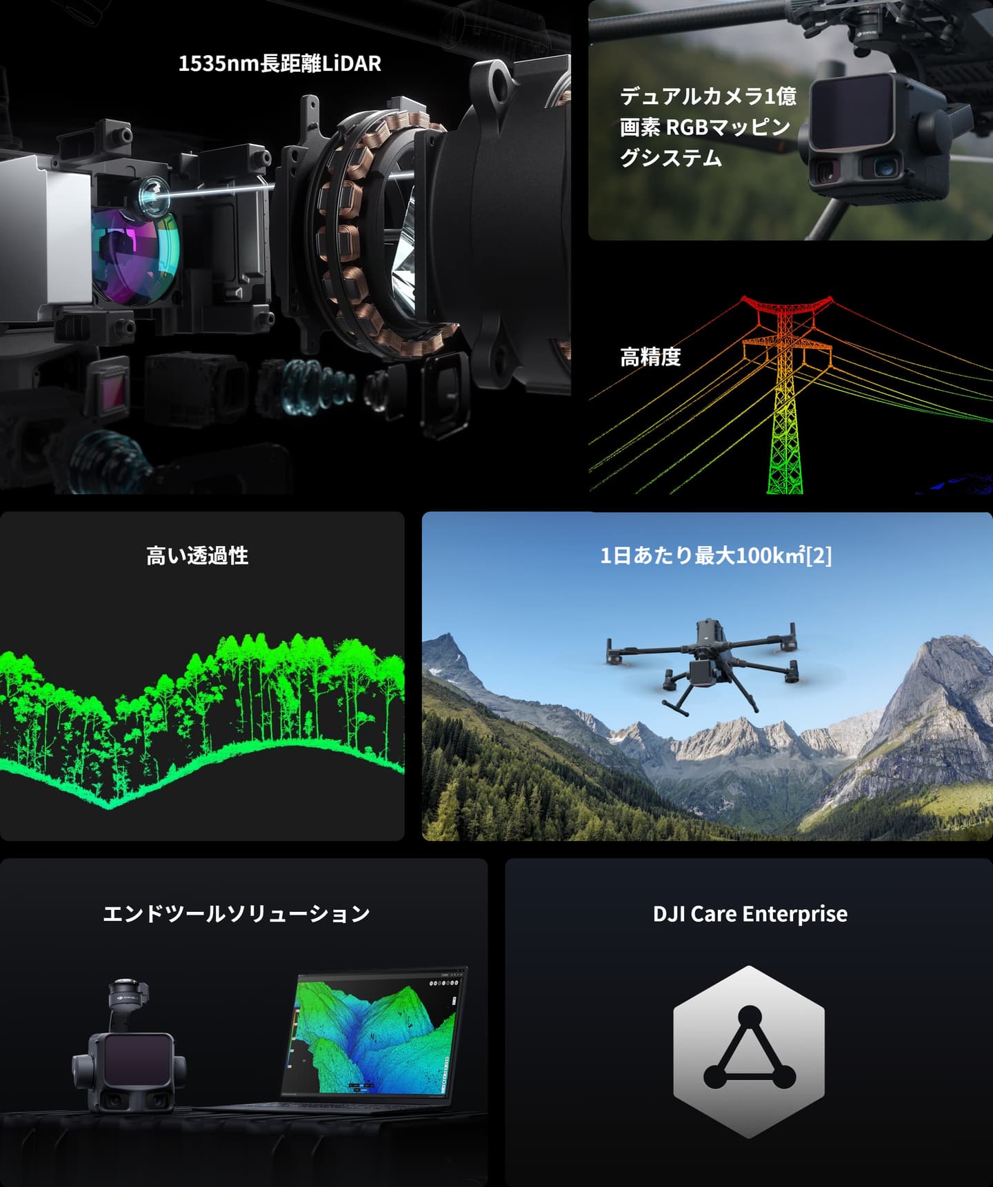 Zenmuse L3は、1535nm長距離LiDAR、デュアル1億画素RGBマッピングカメラ、高精度POSシステム、そして3軸ジンバルをコンパクトな筐体に統合し、そのサイズからは想像できないほどの卓越した性能を発揮します。