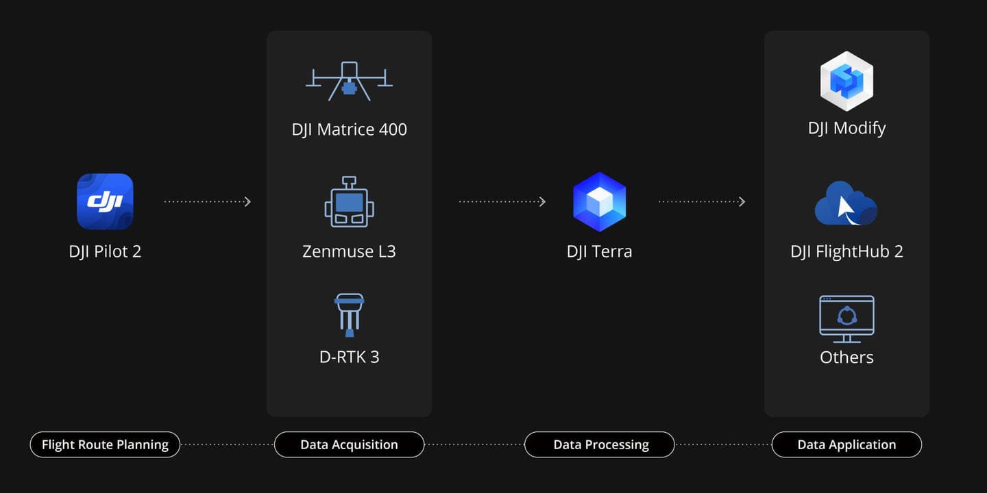 Zenmuse L3 は DJI のエコシステムとシームレスに統合され、ワンストップのマッピングソリューションを提供します。データ取得から処理、活用まで、この統合ワークフローは従来のマルチプラットフォーム構成より操作が簡単で習得しやすく、幅広いマッピング作業を効率的に完了させることができま