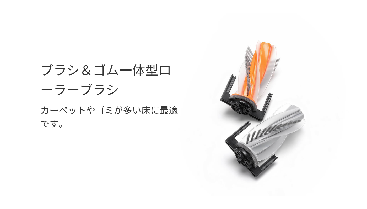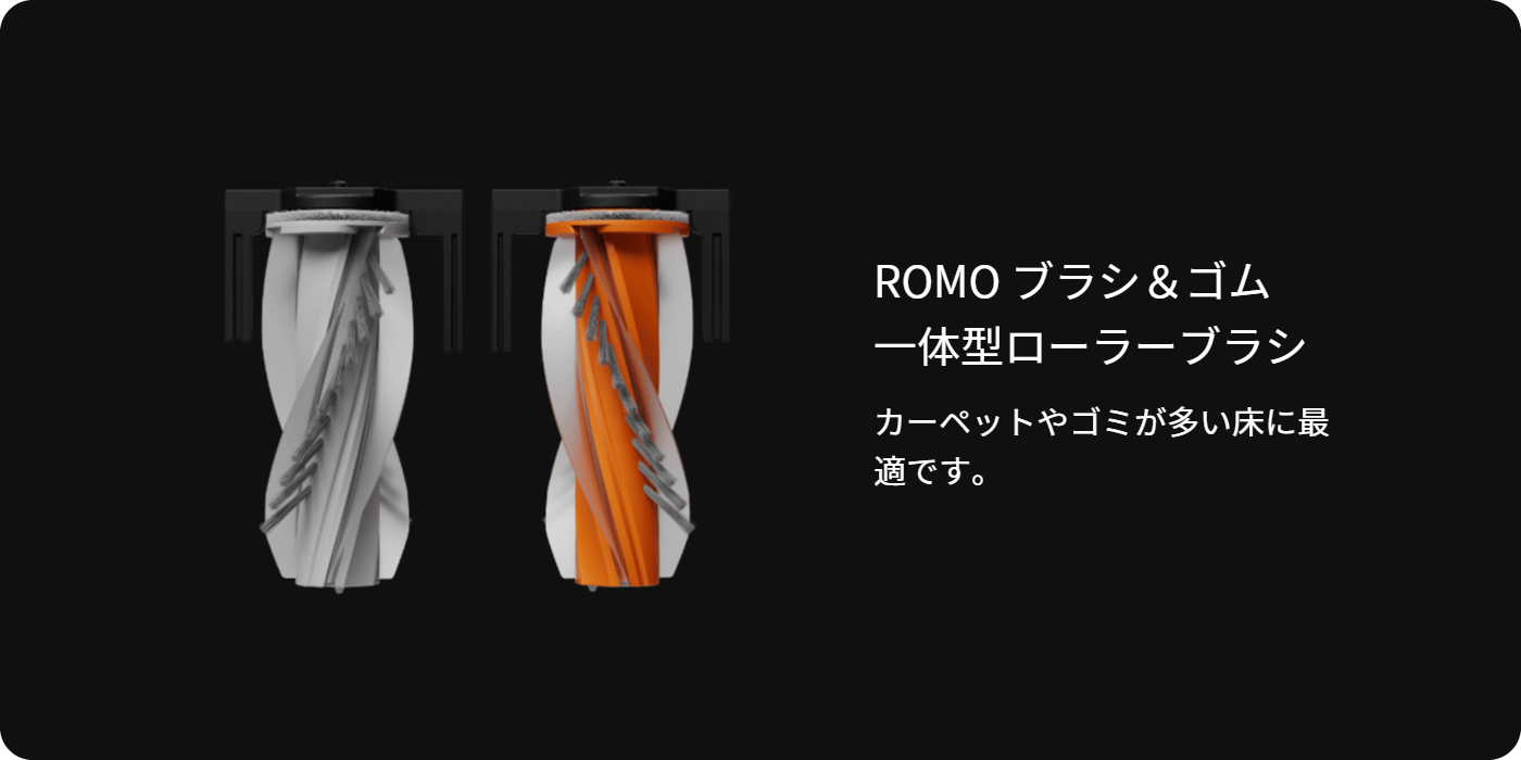 2つの高トルクモーターによって回転するROMO Pのローラーブラシは、強力な性能でゴミを中央の空洞部へ集め、効率的にゴミを吸引します。髪の毛やほこり、食べかすなのど大きなゴミを素早く吸引しながら、スムーズに掃除を行います。