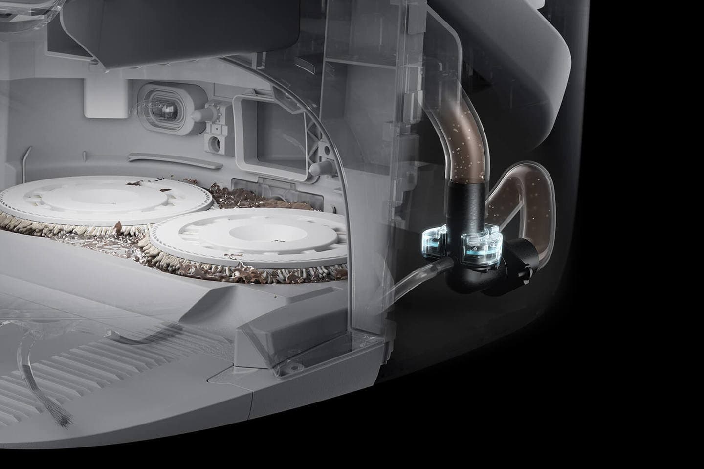 ベースステーションの洗浄板は、汚れの蓄積を防ぎ、清掃を容易にするためのシンプルなデザインが特徴です。高圧ウォータージェットでモップパッドを徹底的に洗浄し、大口径の吸引ポートからゴミを流し出します。