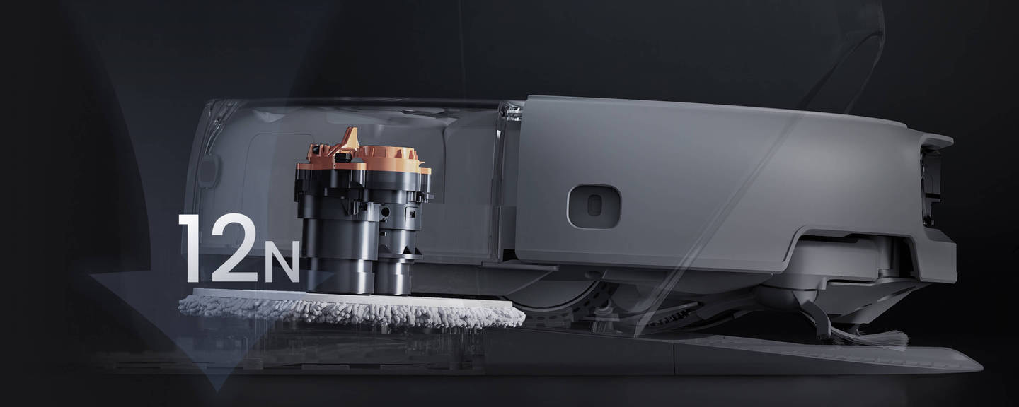 ベースステーションは、モップパッドをよりしっかり洗浄するため、12Nの下方圧力を加えながら洗浄します。