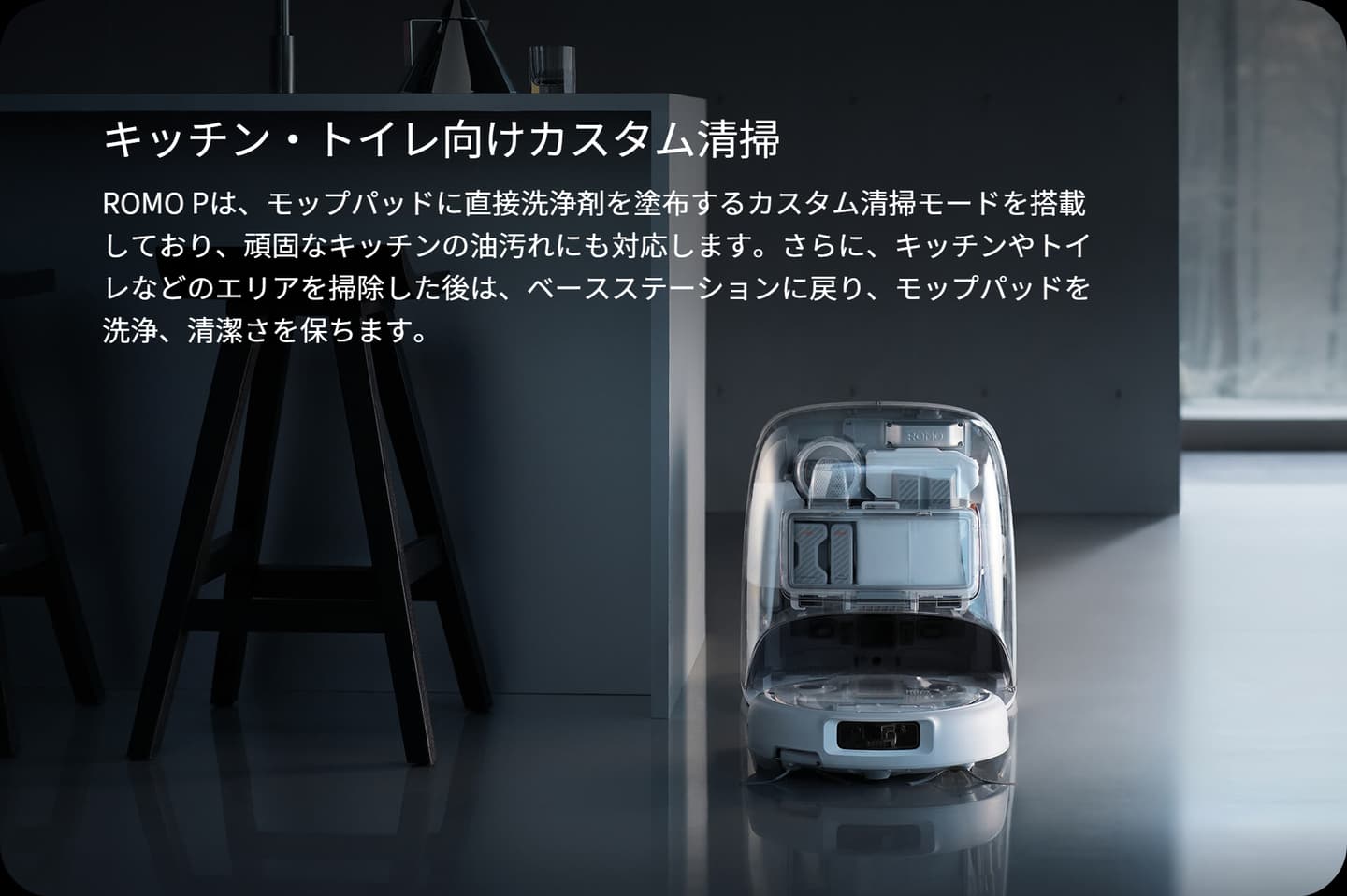 ROMO Pは、洗浄剤、フロア用消臭剤、高温モップ洗浄、高温ダストボックス乾燥、ロボットダストボックスフィルターを併せ持ち、徹底した清掃を行います。