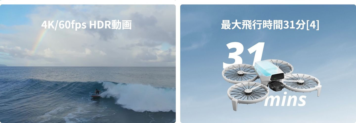 *全データは、制御された環境下にて、DJI Flipの製品版モデルを使用して測定した値です。実際の使用体験は、周辺環境、使用方法、ファームウェアのバージョンによって異なる場合があります。