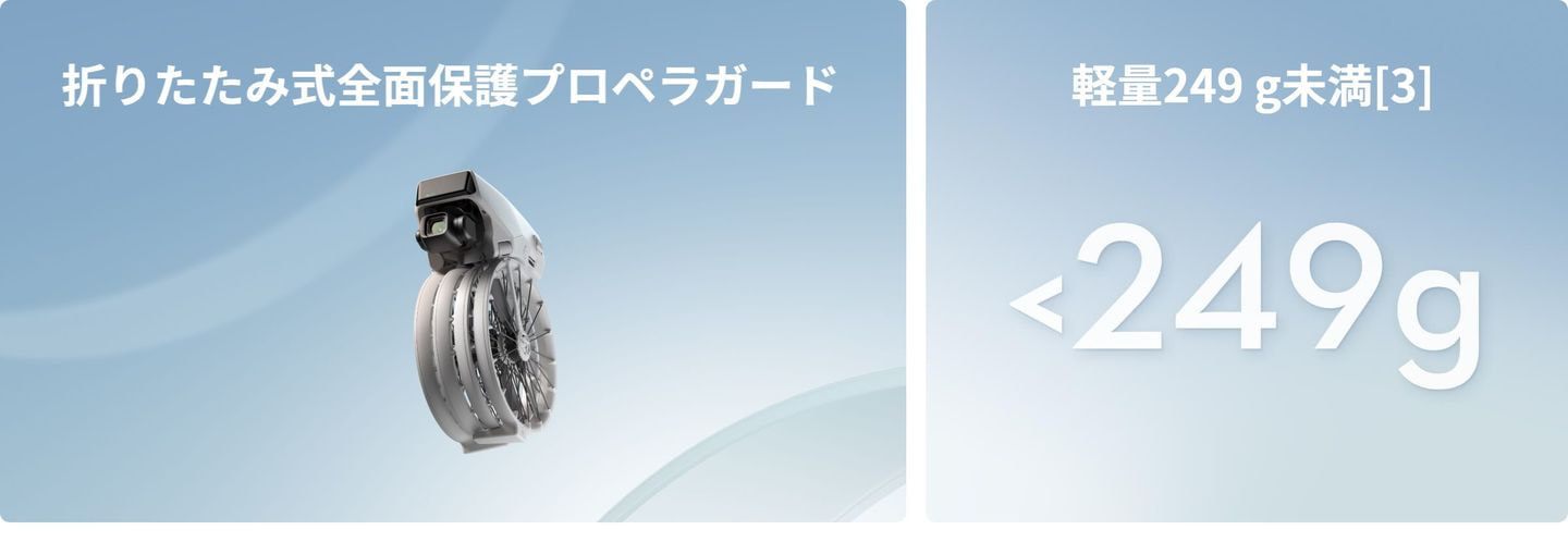 DJI Flipは、DJI製ドローンで初めて折りたたみ式アームに全面保護プロペラガードを装備したドローンです[5]。このガードは、カーボンファイバーのサポート構造を備えており、従来のPC(ポリカーボネート)素材の1/60の重量でありながら、同等の剛性を維持しています。この軽量で耐久性のあるデザインにより、飛行時のドローン本体や周囲の安全性を大きく向上し、飛行を始めたばかりのパイロットでも安心して飛行させることができます。