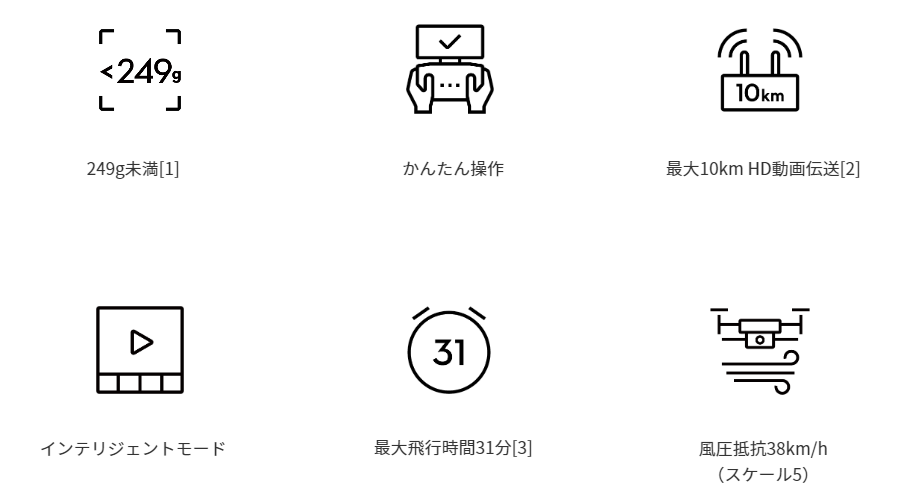 1. 標準機体重量(インテリジェント フライトバッテリー、プロペラ、microSDカードを含む)です。実際の製品重量は、バッチ材料や外的要因により多少異なる場合があります。ほとんどの国や地域では、本製品を飛行させるためのトレーニングや試験が不要です(日本国内では、ご使用の前に、適用される全ての法律および規則に従って、飛行許可・承認や機体の登録手続き等を行ってください)。ご使用の前に、現地の法律および規制を常にご確認ください。