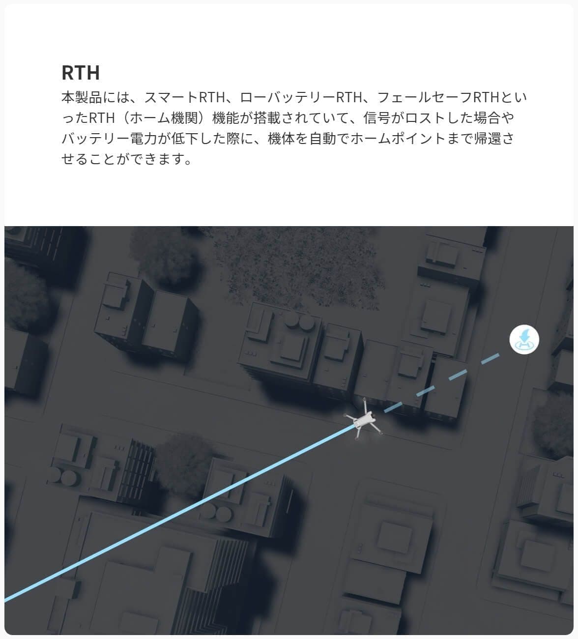 | 電波干渉および障害物のない開けた屋外環境での測定値です。上記のデータは、各基準下での復路のない片道飛行で最も遠い通信範囲を示しています。飛行中は、DJI Flyアプリで表示されるRTH(ホーム帰還)に関するリマインダーにご注意ください。 | |