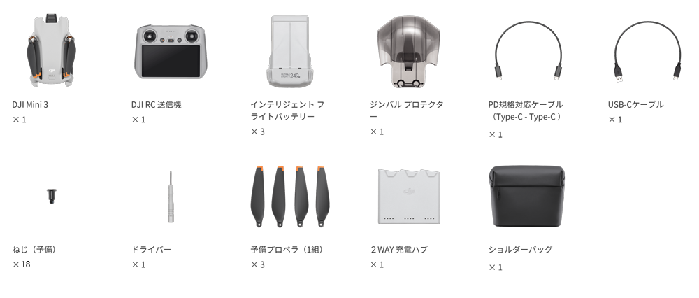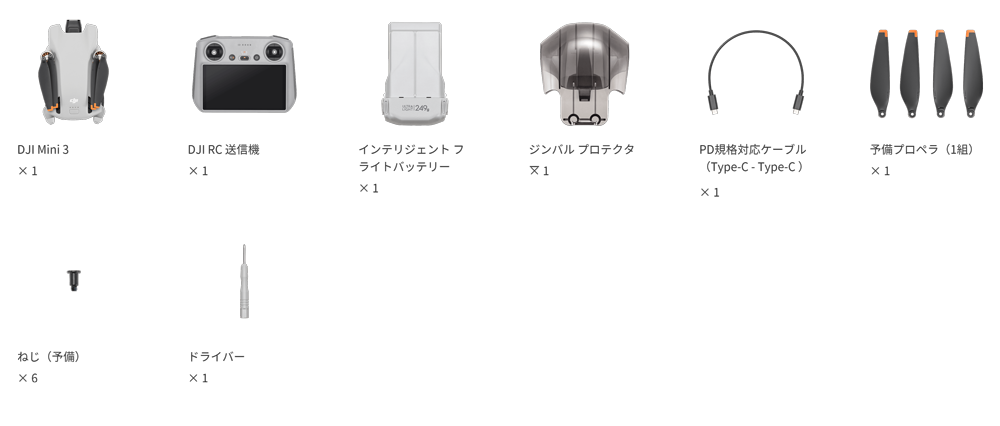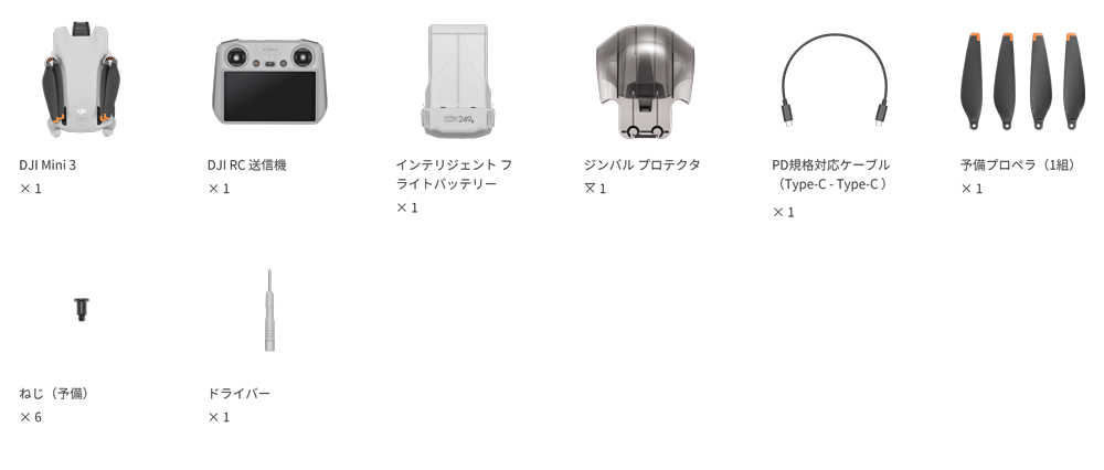 | 名称 | DJI MINI 3 Fly More コンボ(DJI RC付属:ディスプレー一体型送信機) |