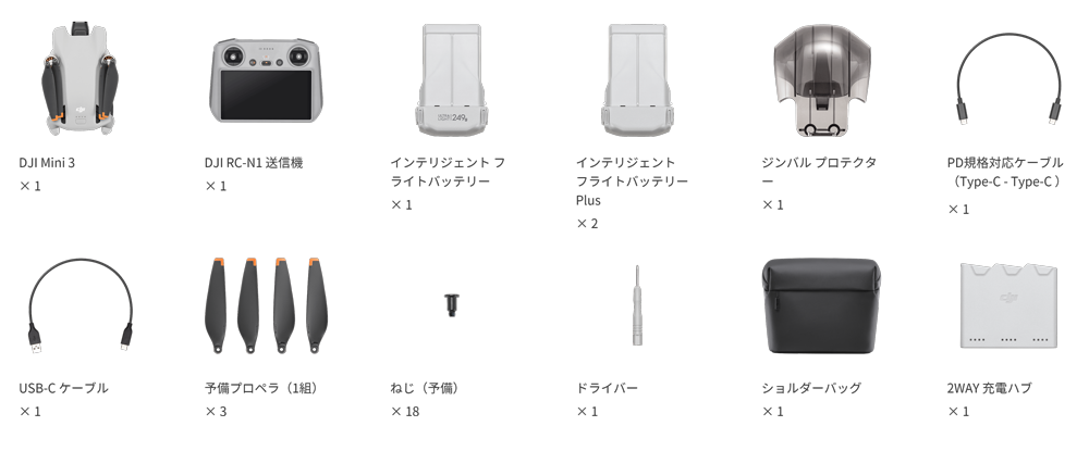 | 名称 | DJI MINI 3 Fly More コンボ Plus(DJI RC付属ディスプレー 一体型送信機) |