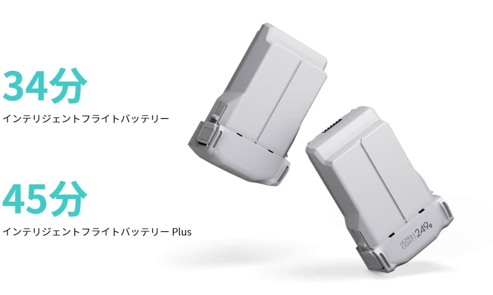1. 実際の製品重量は、バッチ材料や外的要因により多少異なる場合があります。一部の国と地域では、登録は不要です(日本国内では、ご使用の前に、適用される全ての法律および規則に従って、飛行許可・承認や機体の登録手続き等を行ってください)。インテリジェント フライトバッテリー Plusを使用すると、機体の重量は249 gを超過します。飛行する前に、現地の法律および規則をご確認ください。
