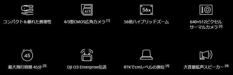 [2] ヨーロッパ地域で使用する場合、スポーツモードの最大速度は19m/sです。[3] 離着陸時の最大風圧抵抗のことを示します。[4] Mavic 3 Enterpriseシリーズを、無風環境下の海抜高度で、バッテリー残量が0%になるまで定速32.4 km/hで飛行し測定。このデータはあくまで参考用です。飛行中は、DJI Pilot 2アプリのRTHリマインダーに注意してください。[5] 赤外線カメラレンズを高エネルギー源(太陽、溶岩、レーザービームなど)に向けないでください。カメラのセンサー焼けが生じ、回復不能な損傷につながることがあります。[6] 一部の国や地域では、5.8 GHzや5.1 GHzの周波数の使用が禁止されている場合があり、また、5.1 GHz周波数が屋内での使用のみ許可されている場合もあります(日本では、5.8 GHz帯は使用不可)。詳しくは、現地の法規制を確認してください。[7] 障害物や干渉がない場所で測定。上記のデータは、一方向の最大通信距離を示します。各基準に準拠した環境で、機体(ペイロードなし)を真っ直ぐに飛ばし、ホームに引き返すことのない状態で測定したもので、あくまで参考用です。飛行中、DJI Pilot 2アプリ上に表示されるRTHリマインダーに注意を払ってください。[8] 異なる地域の各基準に準拠し、障害物がなく、一般的な干渉のある環境下で測定。このデータはあくまで参考用の値であり、実際の飛行距離を保証するものではありません。[9] 2.4GHzと5.8GHzの両方の周波数帯の使用が認められた国/地域で、少し電波干渉のある環境下で測定。公式に推奨されているmicroSDカードに保存された映像を使用。 ダウンロード速度は、実際の状況により異なる場合があります。[10] 今後、DJIの他の機体にも対応する予定です。公式サイトで最新情報をご確認ください。[11] データは、制御された環境下で測定されたもので、あくまで参考用です。実際の使用状況は、様々なソフトウェア バージョン、音源、特定の環境、その他の条件によって、異なる場合があります。