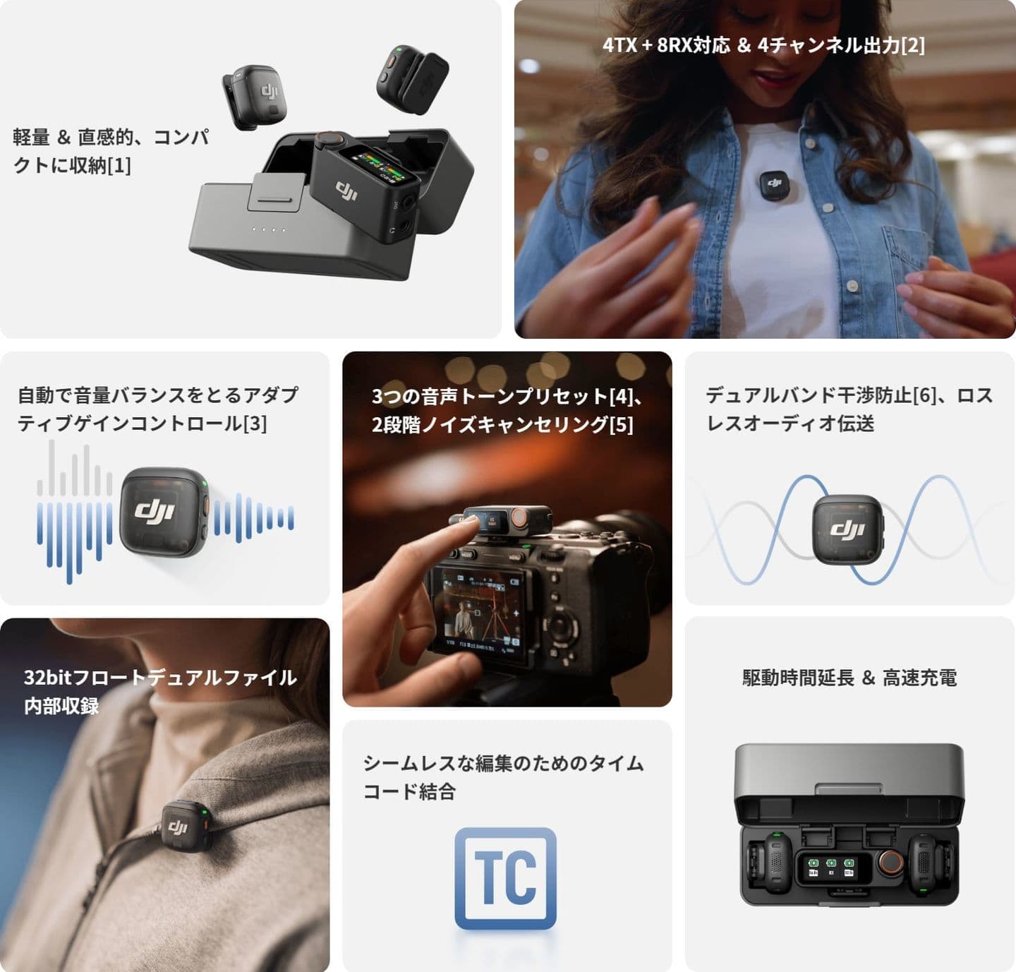 トランスミッターは、レシーバーなしで Osmo 360、Osmo Action 5 Pro、Osmo Action 4、Osmo Pocket 3に直接接続できます[19]。DJI OsmoAudio™接続のエコシステムにより、上質なサウンドが実現するとともに、ギアやワークフローを簡素化して創作プロセスの効率を高めることができます。