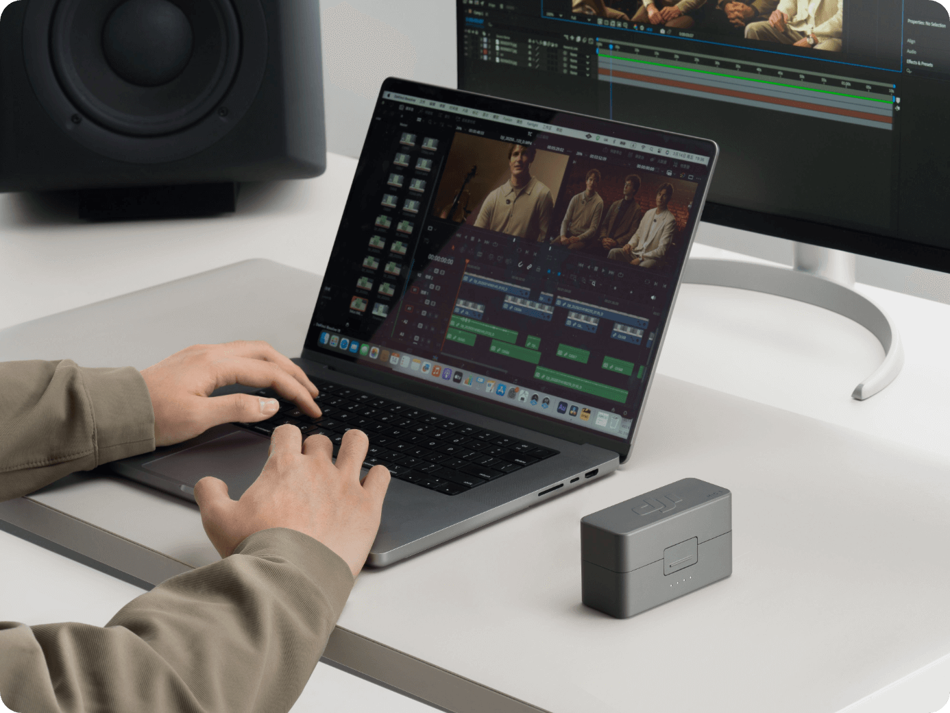 撮影が終わったら、充電ケースとUSB-Cデータケーブルを使用して、両方のトランスミッターをコンピューターまたはスマートフォン[12]に接続します。内部収録されたすべてのファイルを一度に転送でき、編集や共有がこれまで以上に簡単になりました。トランスミッターをDJI Mimoアプリに接続して音声ファイルをダウンロードすることもでき、ニーズに合わせて柔軟なエクスポートオプションを提供します。