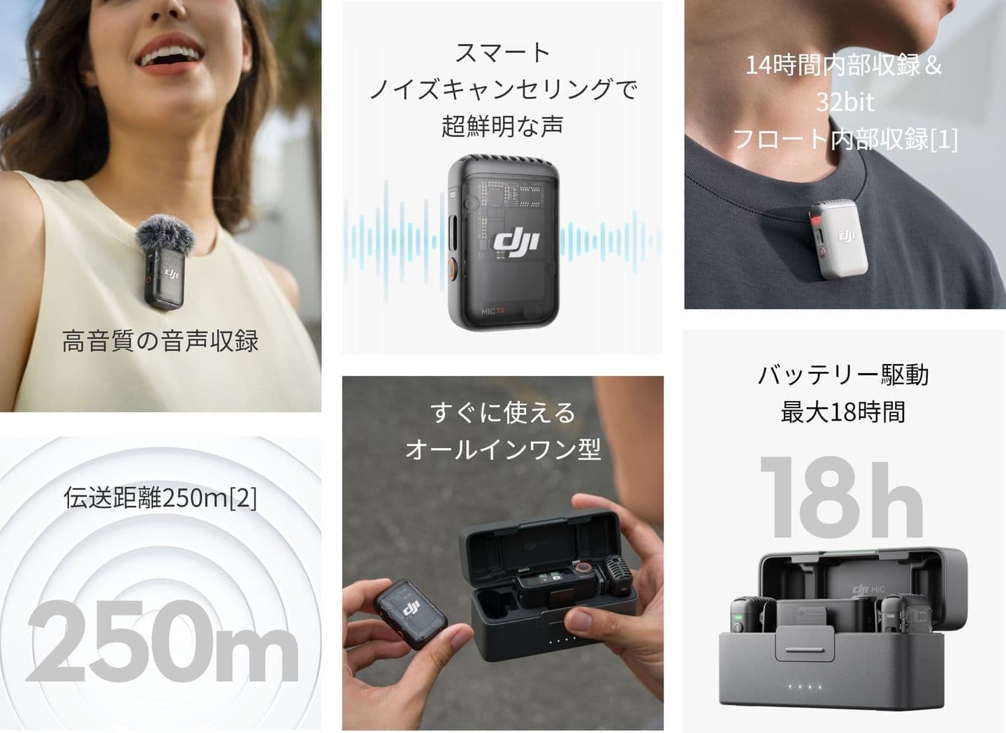 進化したDJI Mic 2は、簡単操作ですぐに使うことができ、リアルな音声を録音します。高音質の音声収録、スマート ノイズキャンセリング、32bitフロート内部収録などの優れた機能を搭載し、様々な音声をバランス良く鮮明に収録でき、Vlog、インタビュー、ライブ配信などでの録音に最適です。