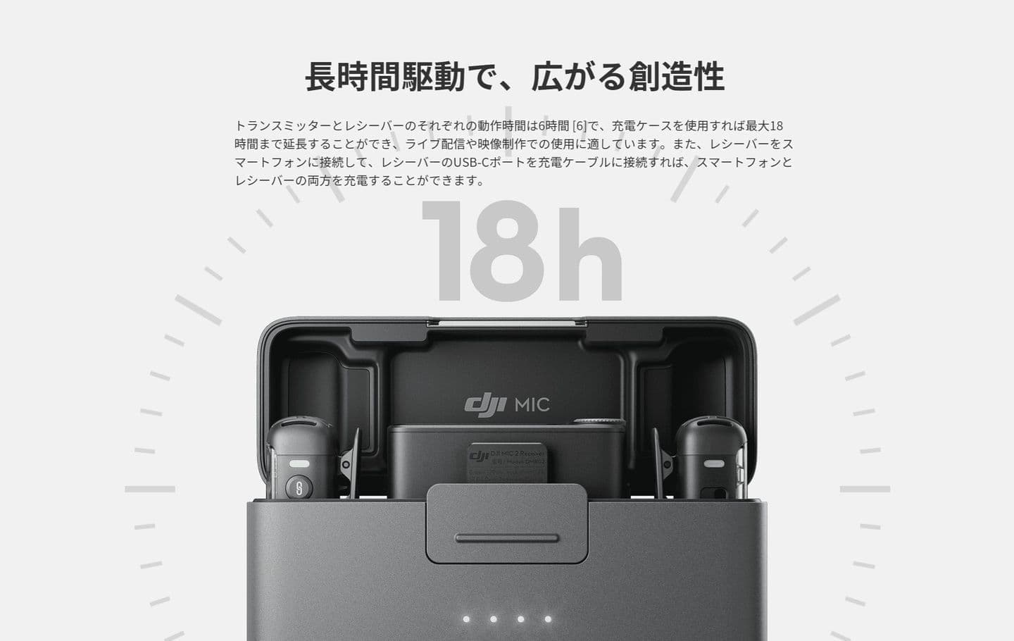 DJI Mic 2 充電ケースは、ペアリングのプロセスを簡素化し、レシーバーとトランスミッターを充電しながら、自動でペアリングを行います。満充電された充電ケースなら、バッテリー駆動時間は最大18時間まで延長可能。優れた携帯性を備え、長時間使用が簡単に行えます。