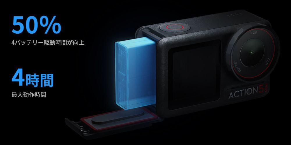 アクションカメラのバッテリーパフォーマンスに新たなベンチマークを確立しました。バッテリー1台で最大4時間の連続使用が可能になりました[1]。Action 4と比べて駆動時間が50%長くなり、最高の瞬間を逃しません。 -20°Cの低温度環境でも、最大3.6時間の撮影が可能です[9]。