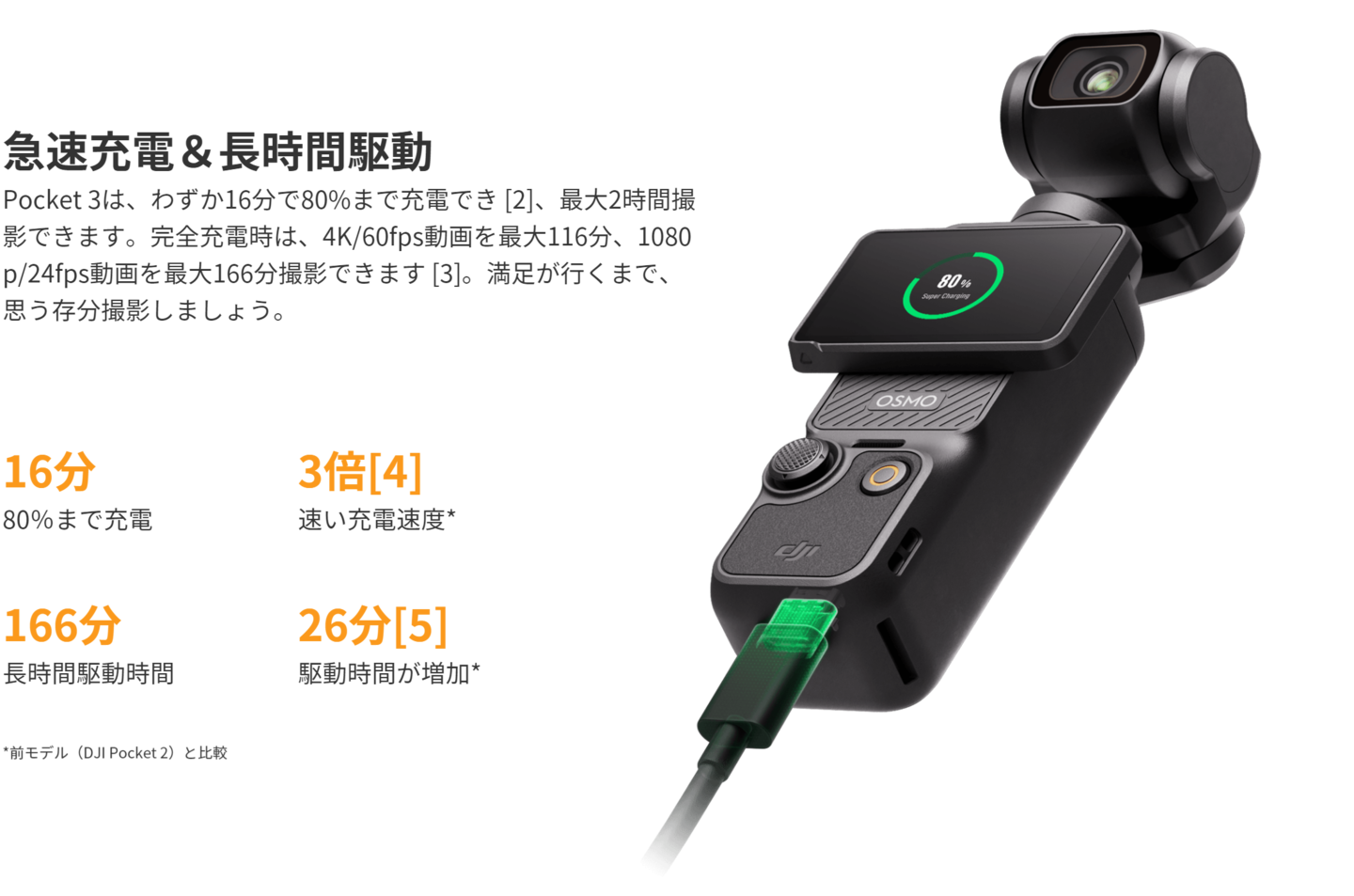 2. Osmo Pocket 3には、1300mAhバッテリーが内蔵されています。16分で80%まで充電でき、32分で100%完全に充電します。DJI 65W PD規格対応充電器(別売)を使用して、ラボ環境下で測定。
