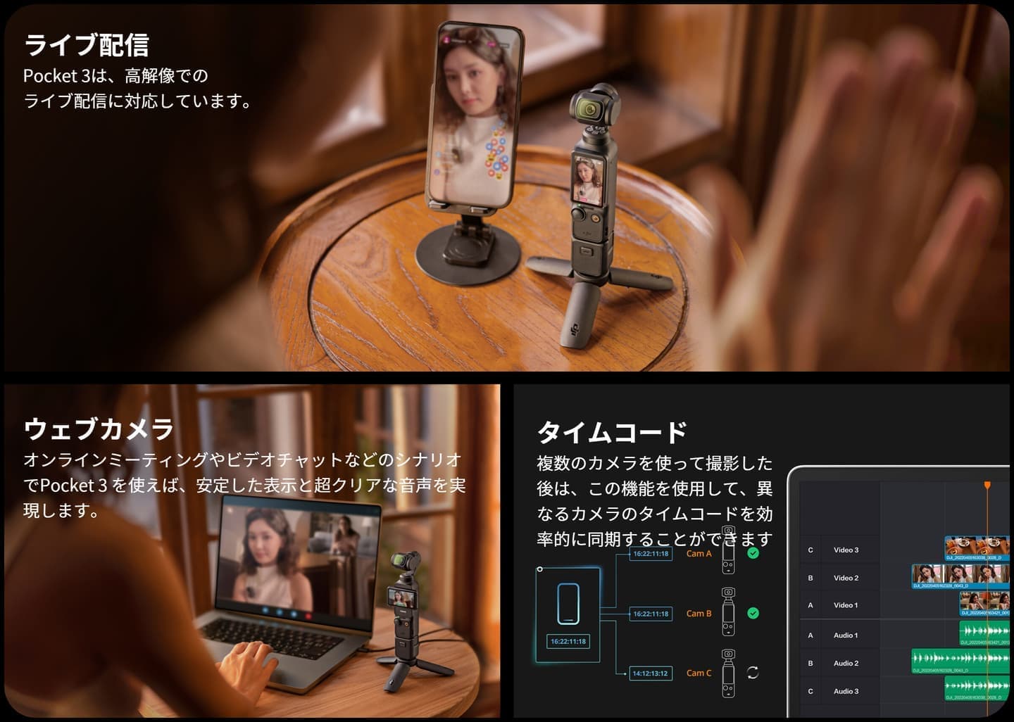 ライブ配信でも、ウェブカメラとして使っても、Pocket 3なら、様々な撮影に柔軟に対応可能。汎用性のある実用的なツールとして活躍します。タイムコード機能を内蔵し、プロレベルの後編集も効率的に行えます。