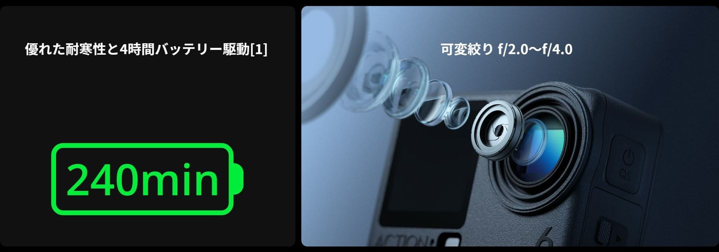 4. オートモードでは、ユーザーは5つの絞り範囲(f/2.0~f/4.0、f/2.2~f/4.0、f/2.4~f/4.0、f/2.6~f/4.0、f/2.8~f/4.0)から選択でき、デフォルト設定はf/2.0~f/4.0です。大口径(f/2.0)モードでは、絞り値がf/2.0に固定されます。絞りモードは、撮影モードやアクセサリーによって制限される場合があります。詳細については、Osmo Action 6の公式ウェブサイトのFAQページをご参照ください。