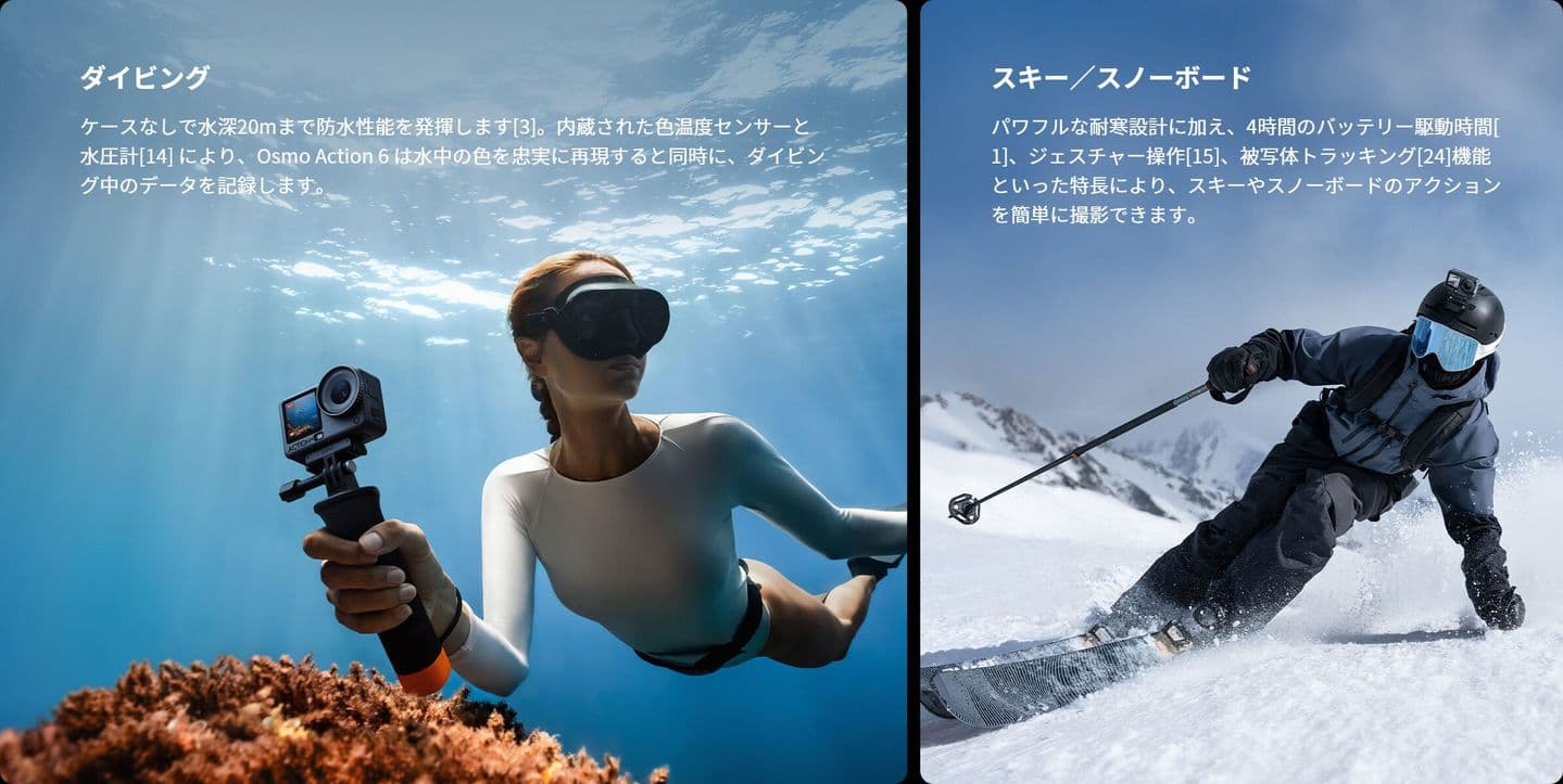 17. Osmo Action 6 スタンダードコンボにはOsmo Action 6 FOVブーストレンズが含まれておらず、別売です。FOVブーストレンズは水中使用(例:ダイビング)には対応しておらず、防滴仕様のみです。FOVブーストレンズが装着されていると、スローモーションは使用できません。