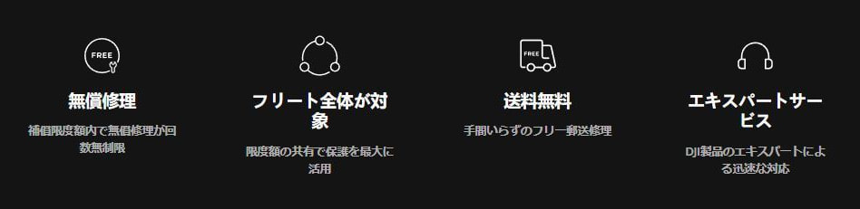 6. 無償修理サービスが回数無制限:保証範囲と限度額の範囲内で無料修理をご利用いただけます。フリート全体の保証範囲:共有保証範囲は、DJI Care Enterprise Plusに紐付けされている最初のアクティベーションおよび紐付けから同期間内(30日以内)の他のDJI Enterprise機器に適用可能です。送料無料:DJI Care Enterpriseの対象地域でご利用いただけます。お客様は、保証範囲を超えて発生した物流費や関税などの追加費用を負担するものとします。