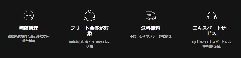 12. 無償修理サービスが回数無制限:保証範囲と限度額の範囲内で無料修理をご利用いただけます。フリート全体の保証範囲:共有保証範囲は、DJI Care Enterprise Plusに紐付けされている最初のアクティベーションおよび紐付けから同期間内(30日以内)の他のDJI Enterprise機器に適用可能です。送料無料:DJI Care Enterpriseの対象地域でご利用いただけます。お客様は、保証範囲を超えて発生した物流費や関税などの追加費用を負担するものとします。