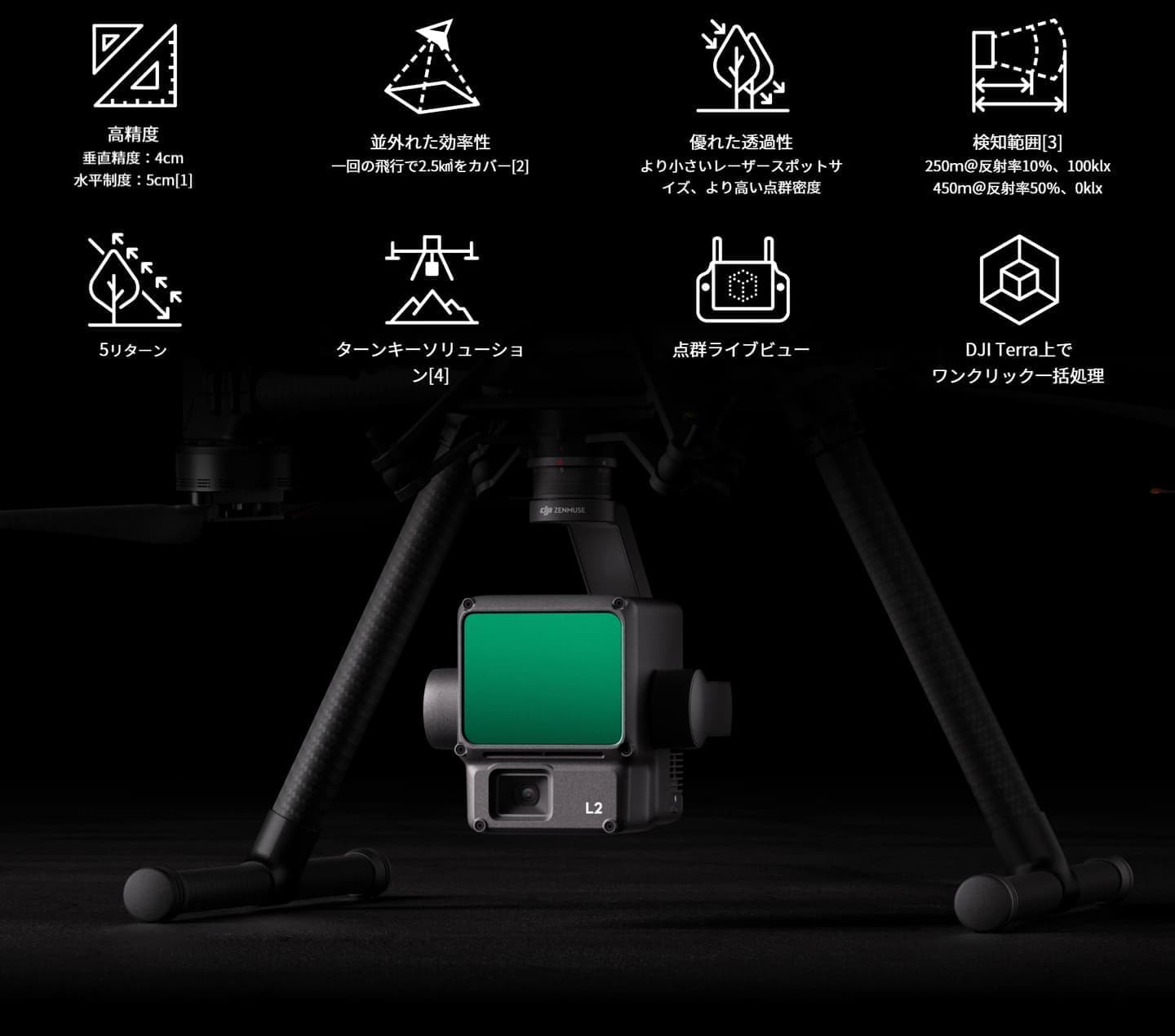 Zenmuse L2は、フレームベースのLiDAR、独自開発の高精度IMUシステム、4/3型CMOS RGBマッピング カメラを一つに統合し、信頼性の高い地形データを取得できる、より高精度で高効率なDJI 飛行プラットフォームです。DJI Terraと併用すると、3Dデータ収集や高精度の後処理を実現するタ